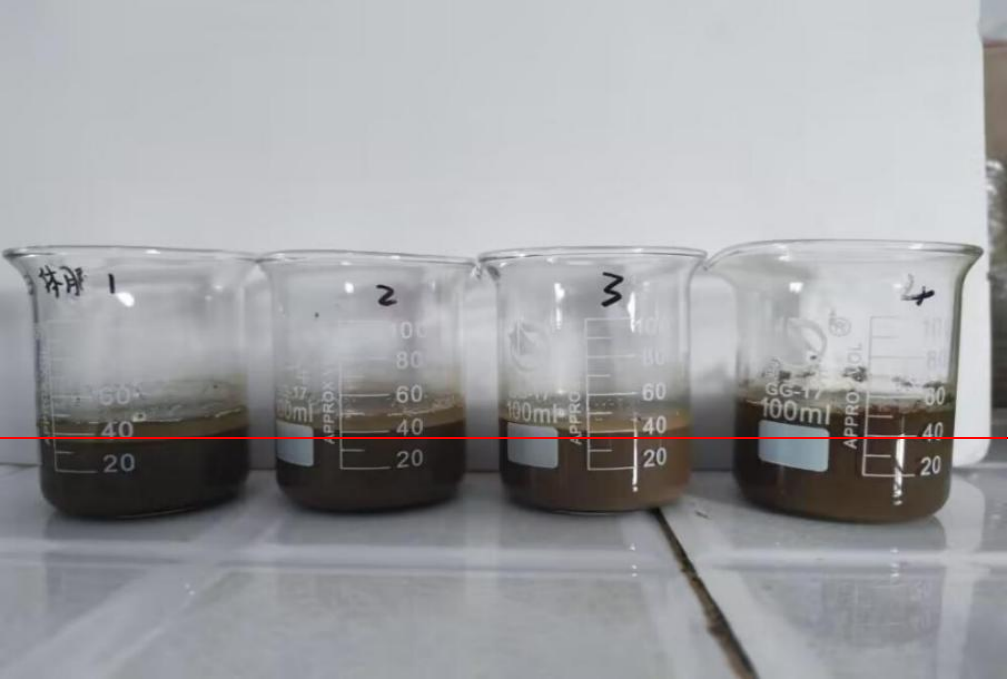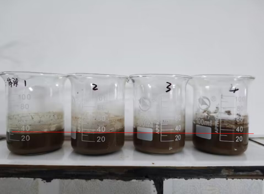 試驗(yàn)方法:取相同板結(jié)地塊過0.5mm篩40g土樣4份加入4個(gè)100ml燒杯中,加水20ml,充分?jǐn)嚢韬箪o置沉淀。