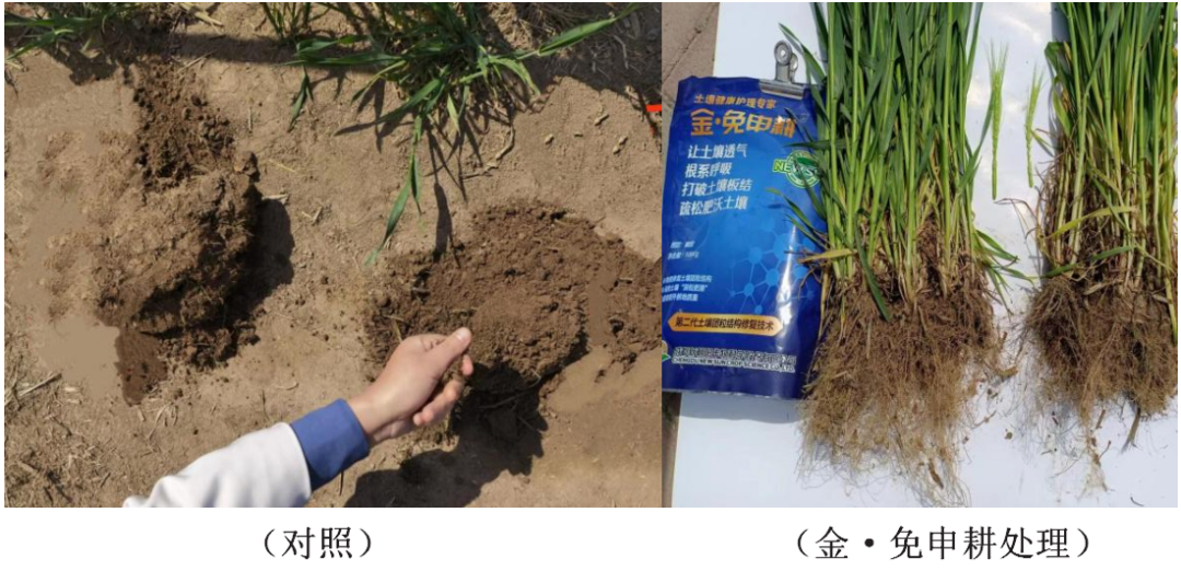 試驗(yàn)結(jié)果:金·免申耕使用后的土壤明顯疏松,小麥長勢強(qiáng),分蘗多,根系好。