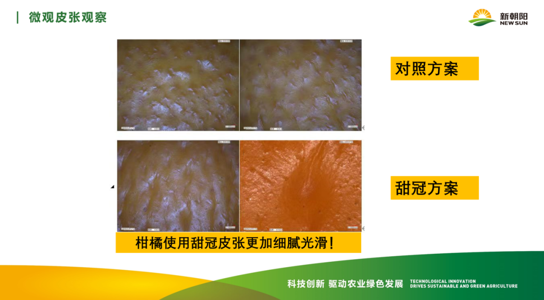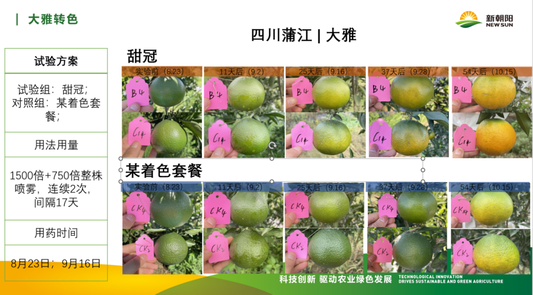 甜冠(冠菌素)適用于各類(lèi)柑橘品種,如愛(ài)媛、金秋砂糖橘、砂糖橘、冰糖橙、金桔、沃柑、耙耙柑、不知火等。促進(jìn)果實(shí)轉(zhuǎn)色、顏色紅潤(rùn),表皮靚麗,提升干物質(zhì)積累,如提升糖度、芳香味物質(zhì)積累,提高果實(shí)品質(zhì),提前上市,提升抗逆性,延長(zhǎng)果實(shí)留樹(shù)保鮮和果實(shí)貨架期,減少流通環(huán)節(jié)損耗。